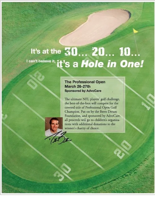 While at AdvoCare, I did a little bit of everything. This included: catalog copy, brochures, marketing collateral, websites, landing pages, and celebrity testimonials. In addition, I created a trio of magazine ads for the Drew Brees Charity Golf Tournament. The one with the bent golf club was the one that Drew Brees selected himself.